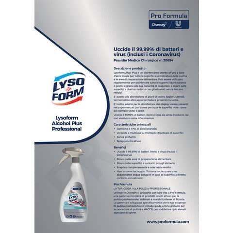 DIVERSEY LYSO FORM ALCOOL PLUS è un disinfettante pronto all'uso per tutti i tipi di superficie per eliminare qualsiasi tipo di virus e batteri